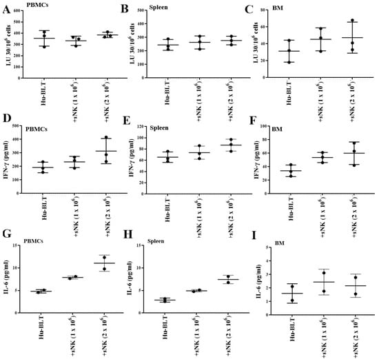 sNK cells induced effects on the immune cell function of disease-free hu-BLT mice. Hu-BLT mice were adoptively transferred with four sNK cell doses every 7 days: 1 × 106 and 2 × 106 sNK cells for 36 days (n = 2–3). Following sacrifice, peripheral blood, spleen, and BM samples were collected; single cell suspensions were prepared, treated with IL-2 (1000 U/mL), and cultured for 7 days; cytotoxicity assays were performed using hu-BLT mice cells as effectors in a standard 4 h 51Cr release assay against OSCSCs; and the LU 30/106 cells were determined using an inverse number of cells required to lyse 30% of OSCSCs x100 (A–C). The supernatants from cultures were harvested, and the levels of IFN-γ (D–F) and IL-6 (G–I) were determined using specific ELISAs.