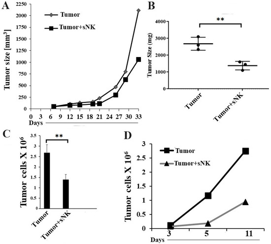 Hu-BLT mice were generated, and human melanoma tumor cells were implanted subcutaneously in the mice as described in the Section 2. In vivo tumor growth was monitored on weekly basis, and we observed a lower tumor growth rate in the mice infused with sNK cells (Figure 3A). Tumor-bearing mice infused with sNK cells did not exhibit morbidity and were able to climb in the cage, whereas untreated tumor-bearing mice became morbid and had complications in climbing and running. The tumor-inhibiting potential of sNK cells was also validated by the small tumor size in the therapeutic group post sacrifice (Figure 3B). When we dissociated the tumor, a higher number of tumor cells (Figure 3C) and increased ex vivo tumor growth (Figure 3D) were observed in the tumors resected from untreated mice compared to the sNK cell-treated group.