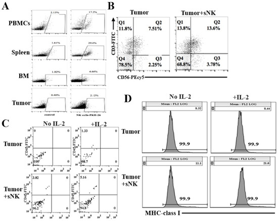 Infusion of sNK cells significantly decreased the size and the weight of the tumor and delayed the growth of tumors (Figure 3). When single cells were prepared from the tumors and equal numbers of tumors from both groups were cultured for several days, much less tumor growth was seen in the tumor cells from tumor-implanted mice treated with sNK cells as compared to the untreated group. We then focused on the type of immune cells circulating in the tumor cells. After single-cell preparation of the tumors, the levels of CD3 and CD56 subpopulations were determined in the tumor microenvironment. There was an increased percentage of CD3-CD56+ NK cells, in addition to an increase in total CD3+ T cells and CD3+CD56+ NKT cells within the tumor cells (Figure 4B). We then cultured the tumor cells with and without IL-2 treatment and measured the circulating CD45+ immune cells. The proportion of CD45+ immune cells was higher in sNK-infused tumor-implanted BLT mice as compared to mice implanted with tumors alone, and the addition of IL-2 further increased the levels of CD45+ immune cells within the tumor cultures. We have previously shown sNK-mediated increase in NK cells and subsequent induction of IFN-γ increased the levels of MHC class I receptors in tumor cells. Accordingly, we observed higher expression of MHC class I receptors in tumors resected from hu-BLT mice infused with sNK cells. Treatment of tumors resected from tumor-implanted hu-BLT mice infused with sNK and treated with IL-2 substantially increased the levels of MHC class I expression when compared to mice implanted with tumors alone (Figure 4D). These studies indicate that sNK cells circulate within the tumor and are likely responsible in part for the increased MHC class I levels in tumors, which we have shown to be part of the four major biomarkers indicating the levels of differentiation of tumor cells [79,80].