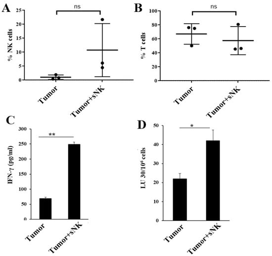 Infusion of sNK cells increased the percentages of endogenous NK cells and restored IFN-γ secretion and NK cell-mediated cytotoxic function in the peripheral blood of melanoma tumor-bearing hu-BLT mice. Hu-BLT mice were implanted with melanoma tumors and injected with NK cells as described in Figure 3. Following sacrifice, peripheral blood was collected, single cell suspensions were prepared, and surface expression of human CD16+CD56+ (n = 3) (A) and CD3 (n = 3) (B) was determined using antibody staining followed by flow cytometric analysis. Peripheral blood-derived single cell suspensions were treated with IL-2 (1000 U/mL) and were cultured for 7 days, after which the supernatants were harvested and the levels of IFN-γ were determined using specific ELISAs (C). Peripheral blood-derived single cell suspensions were treated with IL-2 (1000 U/mL) and cultured for 7 days, cytotoxicity assays were performed using a standard 4 h 51Cr release assay against OSCSCs, and the LU 30/106 cells were determined using an inverse number of cells required to lyse 30% of OSCSCs x100 (D). One of three representative experiments is shown in (C,D). ** (p-value 0.001–0.01), * (p-value 0.01–0.05) and ns (p-value > 0.05).