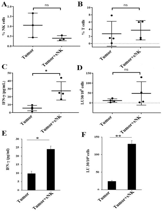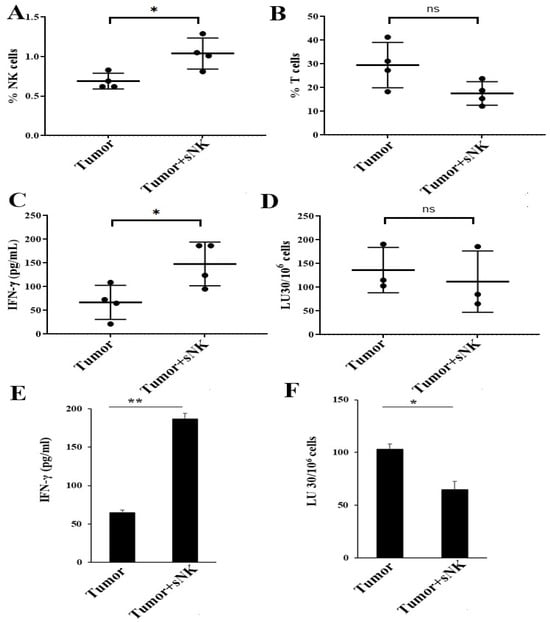 Infusion of sNK cells increased the percentages of endogenous NK cells and restored IFN-γ secretion and NK cell-mediated cytotoxic function in the spleen of melanoma tumor-bearing hu-BLT mice. Hu-BLT were implanted with melanoma tumors and injected with NK cells as described in Figure 3. Following sacrifice, spleen samples were collected, single cell suspensions were prepared, and the surface expression of human CD16+CD56+ (n = 4) (A) and CD3 (n = 4) (B) was determined using antibody staining followed by flow cytometric analysis. Spleen-derived single cell suspensions were treated with IL-2 (1000 U/mL) and were cultured for 7 days, after which the supernatants were harvested and the levels of IFN-γ were determined using specific ELISAs. The average of two to three replicates was used in each mouse (each dot), and four animals are shown in the figure (n = 4) (C). Spleen-derived single cell suspensions were treated with IL-2 (1000 U/mL) and cultured for 7 days, cytotoxicity assays were performed using a standard 4 h 51Cr release assay against OSCSCs, and the LU 30/106 cells were determined using an inverse number of cells required to lyse 30% of OSCSCs x100. The average of two to three replicates was used in each mouse (each dot), and three animals are shown in the figure (n = 3) (D). One of three representative experiments is shown in (E,F). ** (p-value 0.001–0.01), * (p-value 0.01–0.05), and ns (p-value > 0.05).