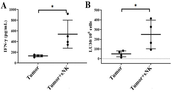 Infusion of sNK cells restored IFN-γ secretion and NK cell-mediated cytotoxic function in the spleen-derived NK cells of melanoma tumor-bearing hu-BLT mice. Hu-BLT were implanted with melanoma tumors and injected with NK cells as described in Figure 3. Following sacrifice, the spleen was collected, single cell suspensions were prepared, and NK cells were purified. Spleen-derived NK cells were treated with IL-2 (1000 U/mL) and were cultured for 7 days, after which the supernatants were harvested and the levels of IFN-γ were determined using specific ELISAs. The average of two to three replicates was used in each mouse (each dot), and four animals are shown in the figure (n = 4) (A). Spleen-derived NK cells were treated with IL-2 (1000 U/mL) and cultured for 7 days, cytotoxicity assays were performed using a standard 4 h 51Cr release assay against OSCSCs, and the LU 30/106 cells were determined using an inverse number of cells required to lyse 30% of OSCSCs x100. The average of two to three replicates was used in each mouse (each dot), and four animals are shown in the figure (n = 4) (B). * (p-value 0.01–0.05).