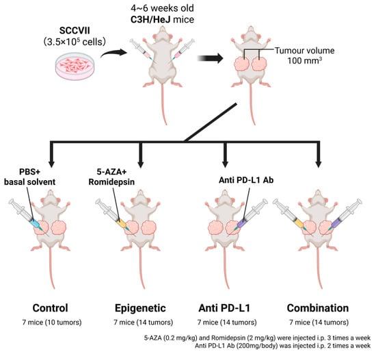 Schema of in vivo homograft therapeutic experiments [22]. SCCVII (3.5 × 105 cells), that is, a murine HNSCC cell line, suspended in 100 μL of PBS was injected into both flanks of 4–6-week-old C3H/HeJ mice. When tumor volumes reached 100 mm3, mice were randomly assigned to four therapeutic groups (seven mice per group). 5-aza, romidepsin, and anti PD-L1 antibody were used for the treatment. 5-aza and romidepsin were administered via intraperitoneal (i.p.) injection three times a week. PD-L1 Ab was administered via i.p. injection twice a week. Therapeutic efficacy was evaluated from the percentage change in tumor volume compared to the tumor volume before treatment was started.