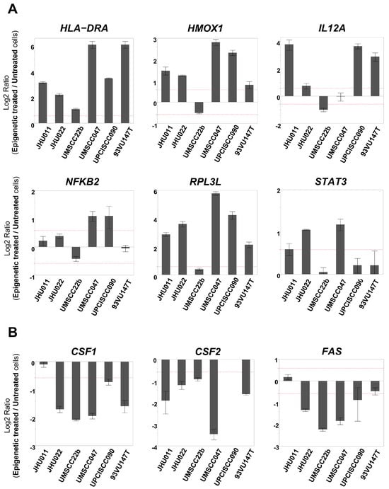 To validate the microarray findings and further investigate immune profile changes following the epigenetic treatment, we utilized a TaqMan Low Density Human Immune Array to evaluate gene expression changes of 90 target immune-related genes and 6 housekeeping genes as a loading control. Genes whose expression levels were altered (either upregulated or downregulated) by 1.5-fold or greater in four or more of the cell lines are listed in Table S2. Among 90 immune-related genes, the expression levels of HLA-DRA, HMOX1, IL12A, NFKB2, RPL3L, and STAT3 were found to be upregulated, and those of CSF1, CSF2, and FAS were downregulated in epigenetically treated cells compared to untreated cells (Table 1). To evaluate these alterations more precisely, these gene expression levels were determined with qRT-PCR using the same primer assays as those found in the array. Compared to untreated cells, in epigenetically treated cells, the expression level of HLA-DRA increased more than 1.5-fold in all six cell lines. The expression levels of HMOX1 and RPL3L were increased in five cell lines, except for UMSCC22b. The expression levels of IL12A, STAT3, and NFKB2 were increased in four, three, and two cell lines, respectively (Figure 2A). On the other hand, the expression levels of CSF1 and CSF2 decreased more than 1.5-fold in five cell lines, and FAS decreased in four cell lines after epigenetic treatment (Figure 2B).