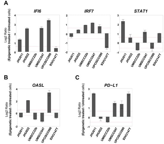 mRNA expression levels of immune-related genes that were determined to be changed in the IFN Response TaqMan custom card. (Each gene expression level was compared between epigenetically treated cells and untreated cells. When the fold change exceeded 1.5 (as indicated by the dotted line), it was determined as ‘increased’ or ‘decreased’). (A) IFI6 was upregulated in four cell lines. The expression levels of IRF7 and STAT1 were increased in three cell lines. (B) The OASL expression level was upregulated in two cell lines and downregulated in four cell lines. (C) The PD-L1 expression level was increased in four cell lines.