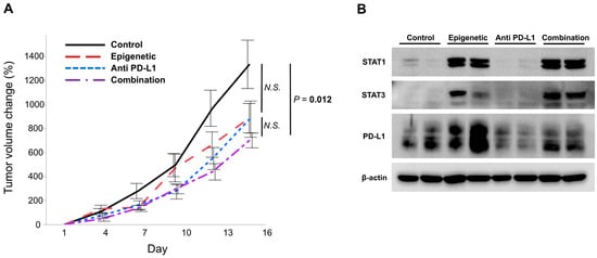 Efficacy of the combinational use of epigenetic drugs and the anti PD-L1 drug in a syngeneic mouse model. (A) The growth of tumors from SCCVII cells was significantly suppressed in the ‘Combination’ group compared to ‘Control’, whereas the ‘Epigenetic’ and ‘Anti PD-L1′ groups did not show statistical differences compared to ‘Control’. (B) When the protein expressions of STAT1, STAT3, and PD-L1 in the treated tumors were evaluated, STAT1 expression was increased in tumors in the ‘Epigenetic’ and ‘Combination’ groups, and STAT3 was increased in tumors in the ‘Epigenetic’, ‘Anti PD-L1’, and ‘Combination’ groups. PD-L1 was increased in tumors in the ‘Epigenetic’ group, and tumors in the ‘Combination’ group expressed higher PD-L1 than those in the ‘Anti PD-L1′ group but lower than those in the ‘Epigenetic’ group.