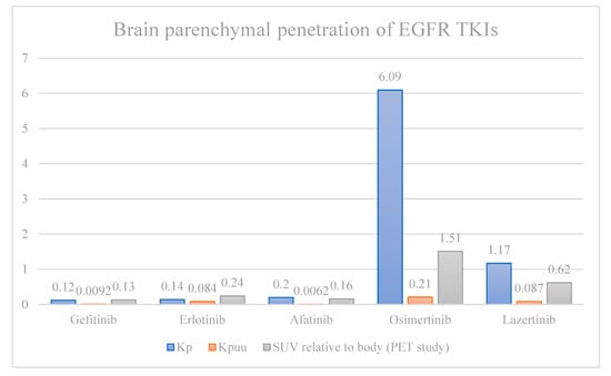 The efficacy of first- and second-generation EGFRmut TKIs is likely limited by sub-optimal CNS penetration when compared to third-generation drugs [24,25,26]. In a direct comparison of CNS penetration rates in rat models, afatinib, erlotinib, and gefitinib penetrated the brain parenchyma at only ~2–3% the rate of osimertinib and ~10–17% the rate of lazertinib, both of which are third-generation EGFRmut TKIs. All were dosed at 10 mg/kg. Even after adjusting for tissue binding, brain penetration was higher with third-generation TKI (Figure 1). A notable exception is rociletinib, a third-generation TKI with poor CNS penetration, which has not been granted FDA approval [27]. PET scans of radiolabeled TKIs showed osimertinib was the only one to reach significant brain exposures in macaques [25]. In animal studies, peak osimertinib brain-to-plasma concentration ratios are around 3.41, compared to 0.21 for gefitinib, and it reaches this level within 10–60 min, with persistence up to 21 days, compared to a peak of 6 h with undetectable levels at 24 h for gefitinib [26,27,28]. Afatinib, on the other hand, has such low CNS penetration that drug levels could not be detected in the brain [27]. Interestingly, osimertinib levels are highest in the gray matter, though existing data is inadequate to suggest a correlation between location of disease and treatment response [28].
