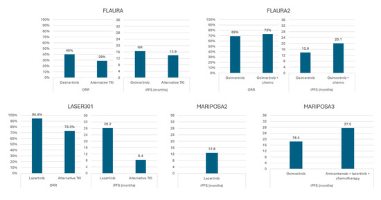 Lazertinib, as mentioned above, is a third-generation TKI with more robust CNS penetrance than earlier generation TKIs and which outperformed gefitinib, both systemically and in the CNS in phase III study [26,44,45]. Though survival data were not mature at time of study publication, subset analysis of the CNS disease cohort found significant, sustained benefit to lazertinib. Median iPFS with lazertinib was 28.2 months versus 8.4 months with gefitinib, and median duration of response was not reached, despite a trend towards larger and more numerous BMs in the lazertinib group (Figure 2) [45]. This is comparable in magnitude to real-world retrospective data of single-agent osimertinib [34,35].