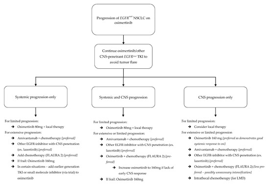 Outside of radiation, multifocal CNS progression also warrants change in systemic therapy to an alternative with good CNS penetration. As detailed, molecular expression profiles in the CNS are different from those outside the CNS when osimertinib resistance develops [36,37]. This may also be the case when resistance develops to other drugs, and the treatment approach should seek to overcome resistance. If CNS progression develops during treatment with osimertinib or furmonertinib, one potential option is to increase the dosage [67,68]. This strategy may be particularly suited to frail patients who are already tolerating these options but may not be candidates for alternative intensified therapies. Other options include switching between CNS penetrant EGFRmut TKIs (ex: osimertinib to lazertinib) or switching from EGFRmut TKIs to an EGFR-targeted antibody (namely, amivantamab). Adding chemotherapy to TKIs may provide benefit with new BMs, but, as detailed above, this may not be effective with progressive LMD. All of the aforementioned strategies can be employed for progressive LMD, with the addition of intrathecal therapy (Figure 4).