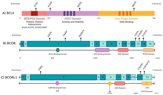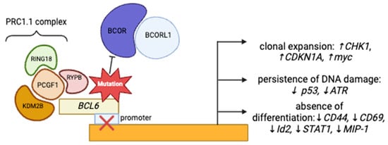 BCOR and BCORL1 are corepressors of the B-cell lymphoma-6 (BCL6) gene (Figure 1) [6] that function as a part of the non-canonical PRC1.1 complex, responsible for the repression of several antitumor genes through chromatin modifications and opposition of the differentiation of cells toward myeloid lineage, through the repression of HOX and Cepb family genes [4,8,9]. The disruption of this complex, e.g., BCOR loss of function, leads to multiple downstream effects, which include the promotion of clonal expansion, persistence of DNA damage, and absence of cellular differentiation, contributing to leukemogenesis [10,11,12].