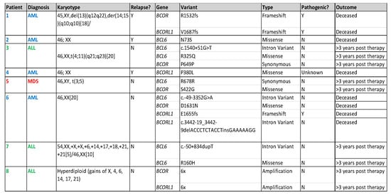 - de Rooij, J.D.; van den Heuvel-Eibrink, M.M.; Hermkens, M.C.; Verboon, L.J.; Arentsen-Peters, S.T.; Fornerod, M.; Baruchel, A.; Stary, J.; Reinhardt, D.; de Haas, V.; et al. BCOR and BCORL1 mutations in pediatric acute myeloid leukemia. Haematologica 2015, 100, e194–e195. [Google Scholar] [CrossRef] [PubMed][Green Version]