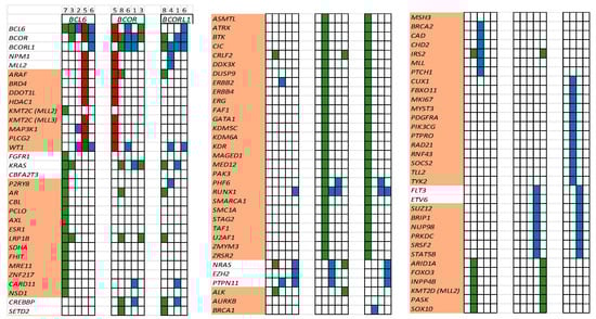 - Li, M.; Collins, R.; Jiao, Y.; Ouillette, P.; Bixby, D.; Erba, H.; Vogelstein, B.; Kinzler, K.W.; Papadopoulos, N.; Malek, S.N. Somatic mutations in the transcriptional corepressor gene BCORL1 in adult acute myelogenous leukemia. Blood 2011, 118, 5914–5917. [Google Scholar] [CrossRef] [PubMed]