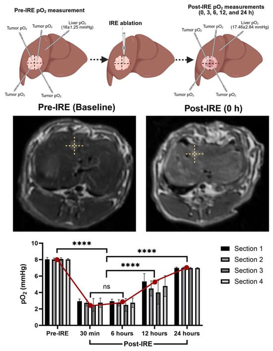 Tumor pO2 measurements significantly change following IRE ablation, lasting for a couple of hours. After post-IRE 24 h ablated tumor may exhibit moderate pO2 rebound and early tissue remodeling. (**** p < 0.001).