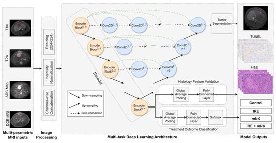 Quantitative analysis of the medical imaging approaches have shown promise in predicting survival in CRLM [91], while AI models have demonstrated high accuracy (>90%) in detecting metastatic lesions [92]. In the context of the proposed combination therapy, AI could potentially optimize the timing of C. novyi-NT delivery based on the evolving TME post-IRE ablation. Recently, our group developed a multi-task deep learning model designed to analyze 3D multiparametric MRI data and identify image biomarkers that reflect TME changes in response to immunotherapies (Figure 2). This model employs encoder–decoder architecture, where the encoder predicts treatment response and TME alterations (validated against histology), while the decoder simultaneously performs tumor segmentation. This comprehensive approach may offer the potential for early, non-invasive assessment of treatment effects, facilitating timely therapy adjustments and ultimately improving outcome prediction, utilizing standard MRI protocols and thus offering a cost-effective and clinically translatable solution without the need for novel imaging technologies.