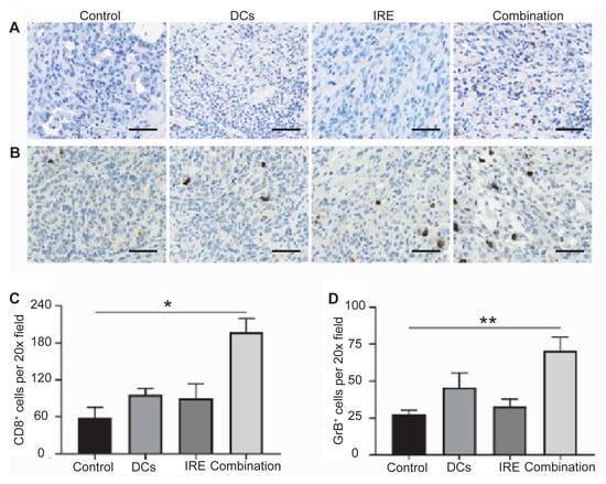Intratumor immune responses of the IRE ablation and dendritic cell vaccination combination. Pancreatic ductal adenocarcinoma tumor CD8 (A) and granzyme B (GrB) (B) staining after different treatments. Relative quantification of CD8+ (C) and GrB+ (D) cells in pancreatic tumors for each group. Scale bars represent 40 μm. (* p < 0.05, ** p < 0.01) (Adapted from Yang et al. [93]).