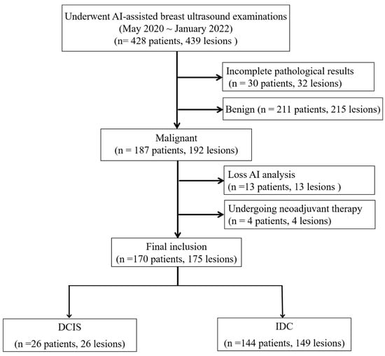 n = 4). The final cohort included 170 women with 175 malignant breast lesions, comprising 149 IDC and 26 DCIS, including 4 patients with two IDC lesions and 1 patient with both IDC and DCIS (