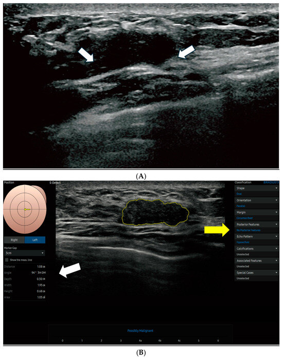 The S-Detect AI system accurately outlined lesion boundaries and calculated the ROI area, which helps standardize analytical measurements across cases. Morphological characteristics were evaluated based on the 5th edition of the ACR BI-RADS lexicon, including shape (oval, round, lobular, or irregular), orientation (parallel or non-parallel), margin (circumscribed, indistinct, angular, microlobulated, or spiculated), posterior acoustic features (none, enhancement, shadowing, or combined), and internal echo patterns (anechoic, hyperechoic, isoechoic, hypoechoic, or complex).