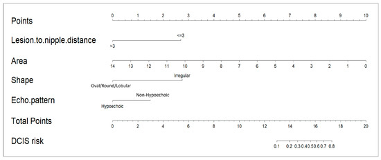p < 0.1) for DCIS probability estimation, lesion area, LND, lesion shape, and echoic pattern were identified as key factors. A shorter LND (≤3 cm) was strongly associated with a higher risk of DCIS (OR = 9.244, 95% CI: 1.778–48.087,