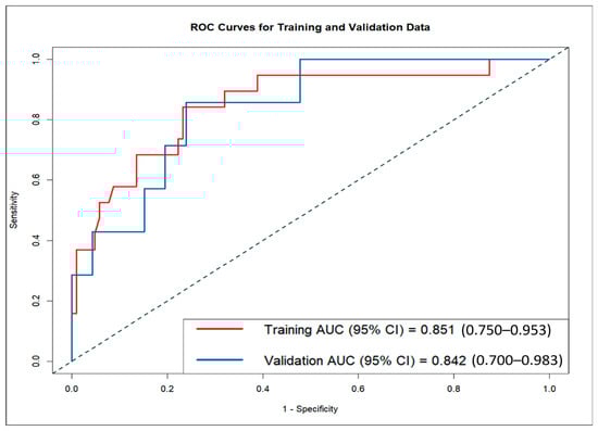 The LND nomogram demonstrated strong discriminatory ability based on ROC curve analysis, with AUCs of 0.851 (95% CI: 0.810–0.892) for the training set and 0.842 (95% CI: 0.774–0.910) for the validation set (
