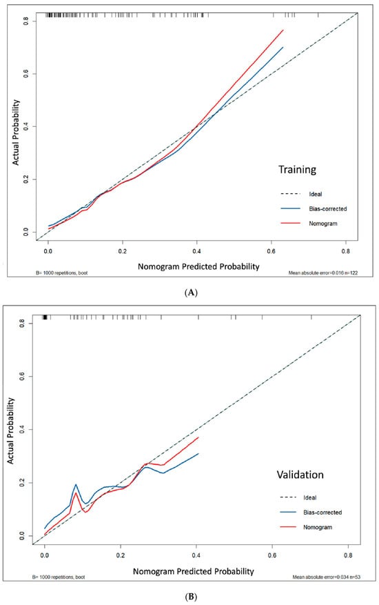 26]. The calibration curves demonstrated strong agreement between predicted and observed outcomes, confirming the model’s reliability for clinical probability estimation, while the high AUC values confirmed excellent discriminative performance [