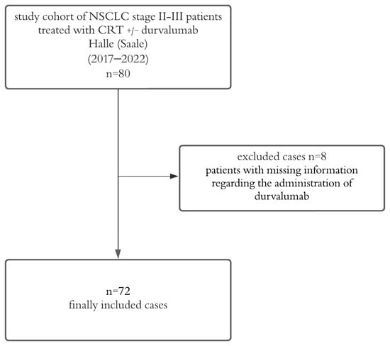 A total of 80 patients with stage II–III non-small-cell lung cancer (NSCLC) who underwent definitive CRT between 2017 and 2022 at Halle (Saale) were identified. After excluding 8 patients with missing information regarding the administration of durvalumab, 72 patients were finally included in the analysis. The patient selection process is summarized in Figure 1.