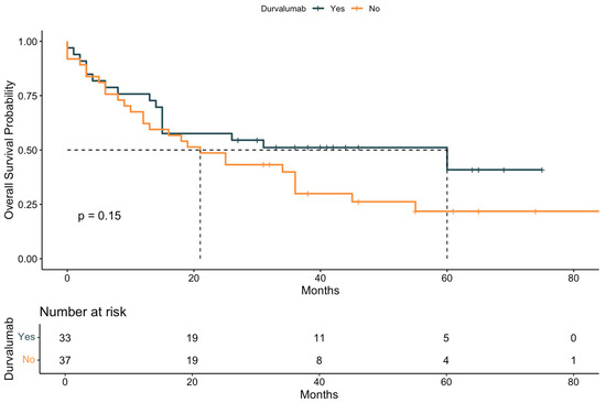 Kaplan–Meier curve for overall survival (OS) stratified by durvalumab treatment. Survival probability is plotted over time (in months) for patients who did or did not receive durvalumab following definitive chemoradiotherapy. Median survival, 95% confidence intervals, and the number at risk are shown for each time point. The p-value was calculated using the log-rank test. The dashed line indicates the median survival of both groups.