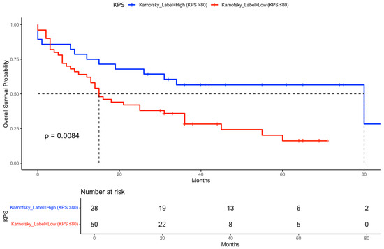 Kaplan–Meier curve for OS stratified by Karnofsky performance status. Overall survival probability is shown for patients grouped by Karnofsky performance status (≤80% vs. >80%). Median survival times and the number of patients at risk over time are indicated for each group. The dashed line indicates the median survival of both groups.
