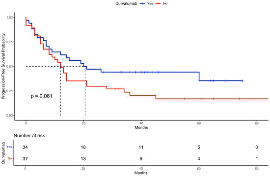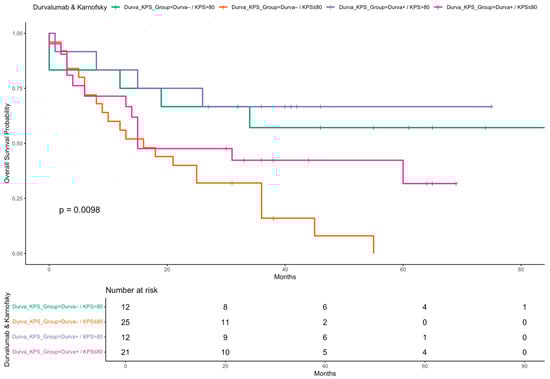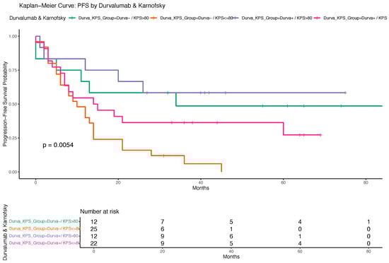 A Kaplan–Meier analysis indicated a trend toward longer PFS among patients who received durvalumab compared to those who did not, although the difference did not reach statistical significance based on the log-rank test (Figure 5). Additionally, Figure 6 displays the PFS stratified by both durvalumab treatment and Karnofsky performance status, demonstrating that patients with a Karnofsky index > 80 and durvalumab therapy had the most favorable outcomes, highlighting the combined prognostic relevance of performance status and treatment.