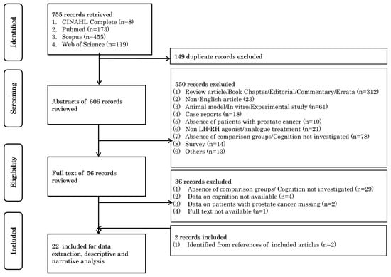 We retrieved a total of 755 records from our database searches. After removing the duplicates, 606 unique records remained. Following the screening of titles and abstracts, 56 potentially eligible records were identified, and their full texts were sought for detailed evaluation. Upon full-text review, 36 records were excluded as they did not meet the inclusion criteria. Additionally, we conducted a reference search of the remaining 20 records, which led to the identification of 2 additional relevant studies. In total, 22 studies were finally selected for data extraction to investigate the effects of LH-RH analogues on cognition [,,,,,,,,,,,,,,,,,,,,,]. The study selection process is summarized in the PRISMA flow diagram shown in Figure 1.
