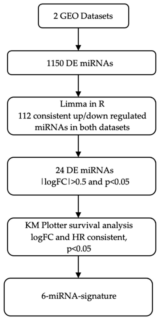 DE miRNAs between responders and non-responders in the two datasets were identified using the Limma package (version 3.44.3) in R software (version 3.11) [12] (https://bioconductor.org/packages/release/bioc/html/limma.html (accessed on 15 October 2020), which is designed for statistical computing and visualization. The Benjamini–Hochberg false discovery rate method was used to obtain adjusted p-values and to correct the occurrence of false positives. Adjusted p-values < 0.05 and |log fold change (logFC)| values ≥ 0.5 were set as the threshold for identifying DE miRNAs among the two datasets. Only miRNAs showing consistent upregulation or downregulation across both datasets and had |logFC|≥ 0.5 were classified as DE between responders and non-responders.