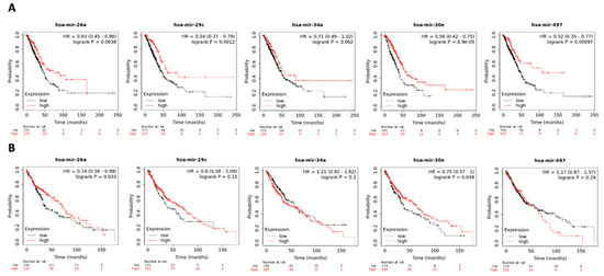 Survival analysis of hsa-miR-26a, hsa-miR-29c, hsa-miR-34a, hsa-miR-30e and hsa-miR-497 in (A) adenocarcinoma (N = 504) and (B) squamous cell carcinoma (N = 472) in KM plotter dataset. Samples are categorized as high (red) and low (black) expression groups for each miRNA. HR and p-value for each miRNA associated with survival are shown within the respective plot.