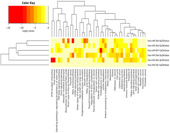Heatmap illustrating the pathways significantly enriched among the targets of the 6 miRNAs. DIANA-miRPath (v3.0) was used to perform the pathway enrichment analysis identifying significantly enriched KEGG pathways associated with the DE miRNAs. Color key shows the statistical significance expressed by the log (p-value); as the color becomes darker, the involvement of the specific miRNA becomes more statistically significant in the specific pathway [14].