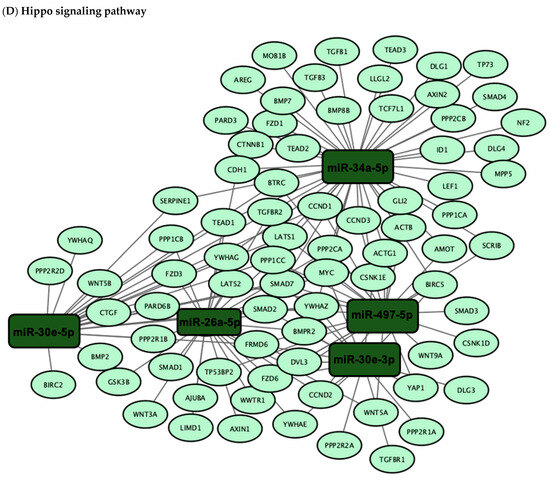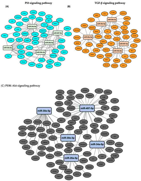 Network visualization of target genes associated with DE miRNAs in the (A) p53, (B) TGF-β, (C) PI3K-Akt and (D) Hippo signaling pathways. The network visualization represents the results of pathway enrichment analysis conducted using DIANA-miRPath (v3.0) to identify target genes associated with the six-miRNA signature. DE miRNAs and their target genes involved in the p53, TGF-β, PI3K-Akt and Hippo signaling pathways were selected and visualized using Cytoscape (v3.10.3). In the network, edges represent the miRNA–gene interactions.