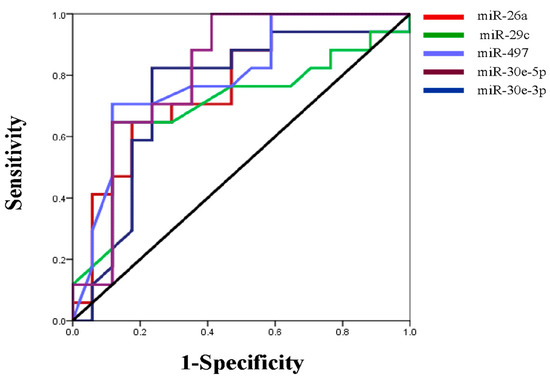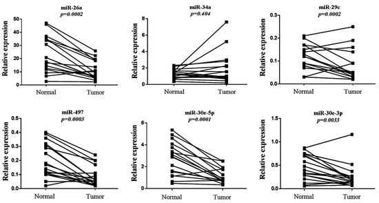 We next evaluated the expression profile of the six-miRNA signature in primary lung adenocarcinoma and their paired normal tissues by qRT-PCR. All miRNAs were significantly downregulated in the tumor compared to normal tissues, except for miR-34a, the same miRNA that showed the weakest prognostic value in our KM plotter analysis (Figure 5). Specifically, the expression of miR-26a, miR-29c, miR-30e-5p, miR-30e-3p and miR-497 were more than two-fold higher in normal tissue compared to primary tumor tissue (Table 3). We further performed ROC curve analysis to evaluate their diagnostic capability. miR-30e-5p along with miR-497 had the highest power to discriminate primary tumors from normal tissues with an AUC of 0.813 (95% CI: 0.661-0.966; p = 0.002 with a sensitivity of 88.2% and a specificity of 64.7%) and 0.794 (95% CI: 0.639–0.966; p = 0.003 with a sensitivity of 70.7% and a specificity of 88.2%), respectively (Table 4, Figure 6).