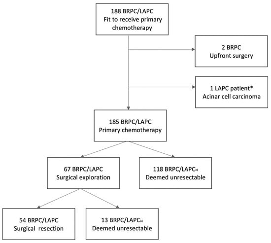 Flowchart of the NORPACT-2 study cohort [5]. * The patient underwent neoadjuvant chemotherapy and surgical resection. ¤ Patients deemed unresectable at response evaluations or during surgical exploration due to metastatic or locally advanced disease. BRPC, borderline resectable pancreatic cancer; LAPC, locally advanced pancreatic cancer.