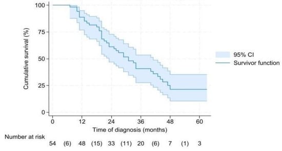 Median OS for the 54 patients who underwent a successful resection was 31 (CI 24.7–37.3) months (Figure 2). In BRPC and LAPC patients, OS was 29 (CI 18.7–39.3) and 34 (CI 20.1–48) months, respectively (p = 0.757). Median OS from time of surgery was 26 (CI 16.3–35.7) months (Supplementary Figure S1), and it was 25 (CI 14.7–35.3) months for BRPC and 29 (CI 10.3–48) months for LAPC (p = 0.816).