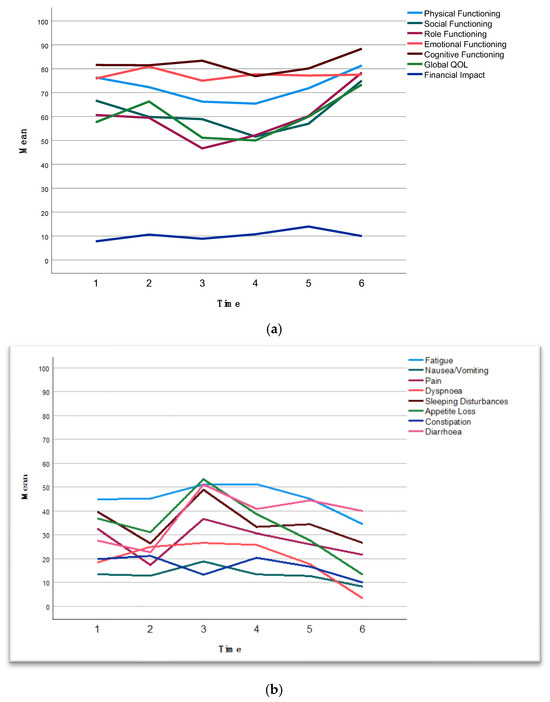 (a) The observed means at given time points for functioning scores of EORTC QLQ C-30. Higher scores on the functional scales indicate better functioning. For financial difficulties, a higher score indicates a greater level of financial difficulty. See Supplementary Table S4 for estimated means with 95% confidence intervals. (b) The observed means at given time points for symptom scores of EORTC QLQ C-30. Higher scores on the symptom scales indicate more severe symptoms. See Supplementary Table S4 for estimated means with 95% confidence intervals. Time points: 1, baseline; 2, before surgery after completion of neoadjuvant chemotherapy; 3, 6 weeks postoperatively; 4, 3 months postoperatively; 5, 6 months postoperatively; 6, 12 months postoperatively.