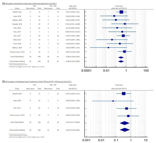 Forest plots showing the comparison between GTR and STR plus XRT groups in patients after EEA for craniopharyngioma resection: (A) all included studies, OR = 0.299 (95%CI: 0.159–0.563; p < 0.001); (B) studies with at least 5 patients in each subgroup, OR = 0.376 (95%CI: 0.177–0.800; p = 0.011). Abbreviations: CI, confidence interval; EEA, endoscopic endonasal approach; GTR, gross total resection; OR, odds ratio; XRT, radiation therapy; STR, subtotal resection.
