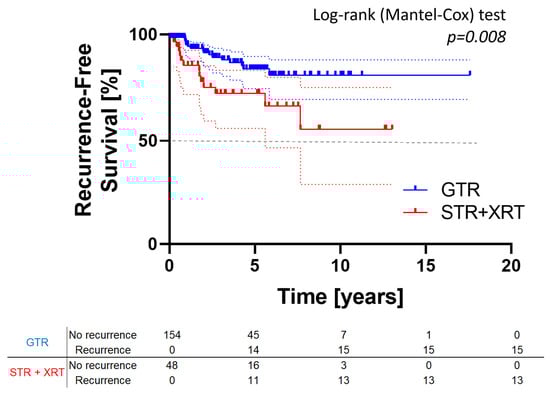 We obtained raw data, including time to recurrence and follow-up duration, from four publications [13,15,16,17], all published between 2017 and 2023. These studies encompass a total of 202 patients, with 154 treated via GTR and 48 with STR plus XRT (see Table 2). Survival analysis (Kaplan–Meier curve with log-rank test) confirmed previous findings, showing a significantly lower recurrence risk in patients treated with GTR compared to STR+XRT (p = 0.008; see Figure 3).