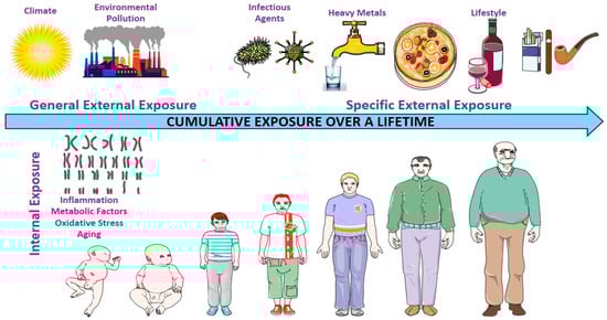 The exposome encompasses the totality of environmental exposures that an individual encounters over the course of their life. These include both external factors, such as air and water pollution, occupational hazards, infections, and diet, and internal biological responses, including inflammation, oxidative stress, and metabolic changes (Figure 1) [9].