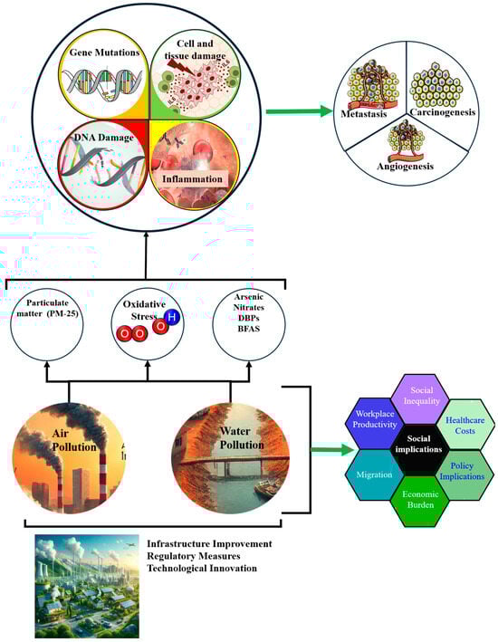 Environmental Health Issues in African LMICs. The diagram demonstrates the complex pathways through which air and water pollution (PM-25, arsenic, nitrates, DBPs, and BFAS) leads to oxidative stress, resulting in gene mutations, DNA damage, inflammation, and subsequent health issues such as metastasis, carcinogenesis, and angiogenesis. Social implications include increased healthcare costs, social inequality, and decreased workplace productivity. Efforts to mitigate these impacts include infrastructure improvements, regulatory measures, and technological innovations.