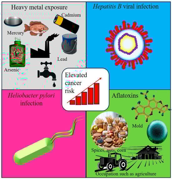 The interplay between infectious agents and environmental exposure is a critical contributor to cancer development, particularly in LMICs. When combined, these factors often amplify each other’s carcinogenic potential, increasing the risk of cancer through synergistic mechanisms of action. A well-documented example is co-exposure to HBV and aflatoxins, which significantly elevates the risk of HCC. Aflatoxins promote DNA adduct formation, whereas HBV suppresses immune surveillance, creating a permissive environment for cellular transformation [77]. Similarly, exposure to heavy metals can intensify the oxidative stress and DNA damage caused by H. pylori [78]. This combination leads to chronic inflammation, a hallmark of carcinogenesis, and increases the risk of gastric cancer [79].