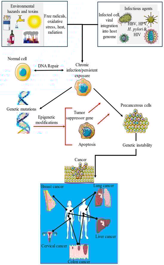 Synergistic interactions between environmental toxins and infectious agents in cancer development. This schematic illustrates how environmental exposures such as air pollutants, tobacco smoke, unhealthy diet, and alcohol consumption interact with infectious agents, such as HBV, HPV, H. pylori, and HIV, to drive the onset and progression of various cancers (e.g., lung, breast, colon, liver, and cervical). These combined exposures lead to genetic and epigenetic alterations, such as DNA damage, gene mutations, and disruption of gene expression. These molecular changes impair key cellular processes, including apoptosis, cell cycle control, and immune surveillance, thereby promoting cancer development. This figure highlights the complex and multifactorial etiology of cancer, particularly in high-exposure settings that are common in LMICs.