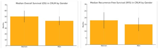 Gender-based differences significantly impact the management and outcomes of CRLM. While surgical resection remains the cornerstone of curative treatment for CRLM, women are notably 23% less frequently treated with surgery than men, even after accounting for patient and tumor characteristics []. This underrepresentation in surgical treatment may help explain observed differences in survival []. Women are also more likely to present with right-sided primary tumors and BRAF mutations, both associated with poorer prognosis. Nonetheless, hormonal factors, particularly the potential protective role of estrogen, may contribute to better survival outcomes in women []. In terms of chemotherapy, gender influences both tolerability and efficacy. Women are more prone to neurotoxicity from oxaliplatin and to hand–foot syndrome from capecitabine, often requiring dose adjustments that can affect therapeutic efficacy []. However, women typically present with fewer comorbidities than men, which may contribute to better systemic treatment tolerance and allow for more optimal dosing. While response rates are generally similar between sexes, women may derive greater benefit from targeted therapies, such as anti-EGFR agents, likely due to differences in tumor biology []. Overall, women with CRLM demonstrate better OS and RFS values than men. The median OS ranges from 40 to 60 months in women versus 35 to 50 months in men, while the RFS is typically 12 to 24 months in women compared to 10 to 20 months in men. These differences may be attributable to a combination of biological, hormonal, and treatment-related factors [] (Figure 1).