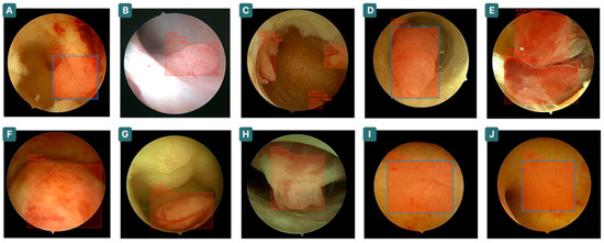 Representative images of lesion detection and classification by the CNN. The images display real outputs with bounding boxes identifying detected areas and classifying findings. Examples include polyps (A–E), myomas (F,G), cancer (H), and normal endometrium (I,J).