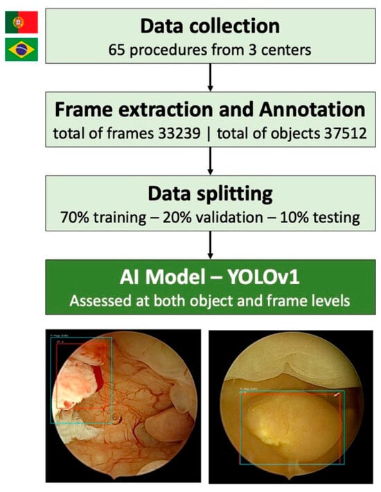 This study included hysteroscopies performed at three centers: Unidade Local de Saúde de Santo António (ULSSA) between June 2023 and February 2024, Unidade Local de Saúde de São João (ULSSJ) between January 2024 and April 2024, and at Ambulatório Médico de Especialidades Barradas São Paulo (AME Barradas SP) between January 2024 and December 2024. A total of 65 procedures were used for the development of the CNN (6 from ULSSA, 26 from ULSSJ, and 33 from AME Barrradas). In ULSSA the hysteroscopies were performed with a Storz hysteroscope and EDDY 3D processor, in ULSSJ the hysteroscopies were performed with a Braun hysteroscope and EDDY 3D processor, and in AME Barradas SP the hysteroscopies were performed with a Bettocchi Storz hysteroscope and Confiance Medical CM-SCAM3 processor. All procedures were performed by experienced gynecologists, following clinical standards including biopsy and resection when indicated.