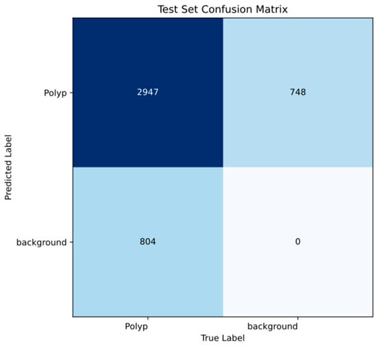 Figure 4 presents a frame-level confusion matrix, included to increase clinical interpretability. In this approach, a frame is considered a true positive if it contains at least one detected polyp. However, this simplification does not account for potential missed polyps within the same frame, as the model’s main evaluation was performed at the object (bounding box) level—vide supra. Therefore, this matrix should be interpreted with caution. Moreover, given the very limited number of background (non-polyp frames) in the test set, calculation of other clinically relevant metrics, such as specificity and negative predictive value, was not feasible.