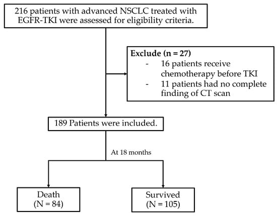 This was a retrospective study that collected the data from Chiang Mai University Hospital between January 2012 and October 2022. This study included adult patients (age ≥ 18 years) diagnosed with advanced or locally advanced EGFR-mutated NSCLC confirmed by pathological evaluation. All patients received at least one dose of a first-line EGFR-TKI as a treatment for advanced or locally advanced NSCLC. The study population was identified using ICD-10 codes (C341–343, C348–349, D381) and prescription records for EGFR-TKIs, including gefitinib, erlotinib, afatinib, and osimertinib. Inclusion criteria required availability of pre-treatment laboratory data such as complete blood count (CBC), creatinine (Cr), liver function test (LFT), and chest CT scan. Patients were excluded if they lacked these pre-treatment data, were receiving palliative end-of-life care at initial diagnosis without EGFR-TKI therapy, or received EGFR-TKI as a subsequent line of treatment. The platelet-to-lymphocyte ratio (PLR), the neutrophil-to-lymphocyte ratio (NLR), and the albumin-to-globulin ratio (AGR) were calculated from the pre-treatment laboratory results.