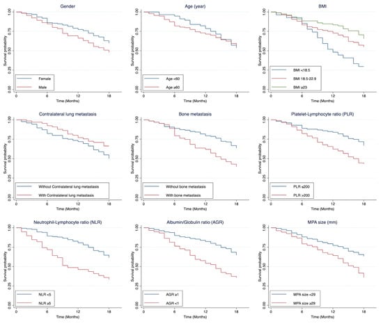 Significant poor prognostic factors identified through univariable analysis included low BMI (<18.5), presence of contralateral lung metastasis, bone metastasis, low hemoglobin, high PMN, PLR ≤ 200, NLR ≥ 5, elevated Cr, AGR < 1, and MPA size ≥ 29 mm. Figure 2 illustrates the survival differences among patients with and without each of these prognostic factors. All significant variables were included in the full model, and Schoenfeld’s residual test indicated no violations of a proportional hazard assumption (p = 0.677).