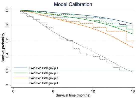 Model performance was evaluated based on discrimination and calibration. Discrimination was assessed using Harrell’s C-statistic to determine the model’s ability to distinguish between patients with longer and shorter survival times. Additional discrimination statistics, including Somers’ D coefficient for Harrell’s C, Royston and Sauerbrei’s D statistic, and R2D, were also reported. Calibration was assessed by comparing predicted survival probabilities with observed survival outcomes using a calibration plot. Survival probabilities were divided into four quantiles, creating four distinct risk groups. The calibration plot was then examined to compare the agreement between the model-predicted survival curves and the Kaplan–Meier survival curves within each quantile.
